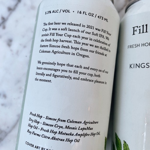 The first beer we released in 2021 was Fill Your Cup. It was a soft launch of our Soft IPA. We revisit Fill Your Cup each year in celebration of the fresh hop harvest. This year we are thrilled to feature Simcoe fresh hops from our friends at Coleman Agriculture in Oregon.